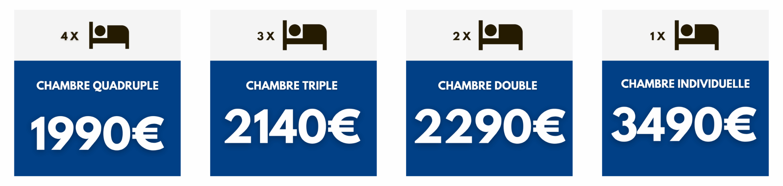 • Assurance de voyages (voir les détails) : à partir de 90€ (par personne)